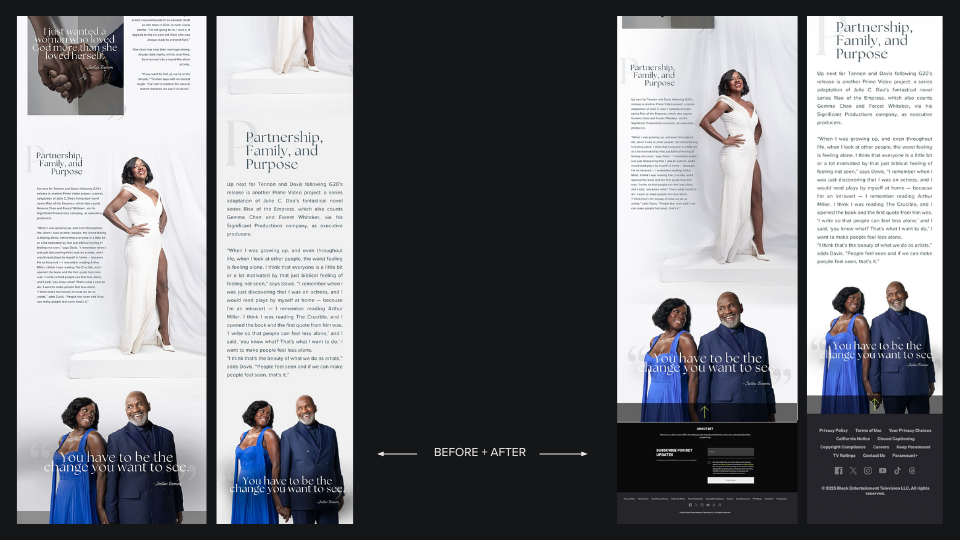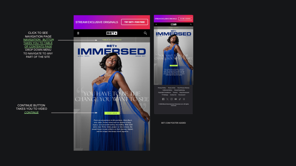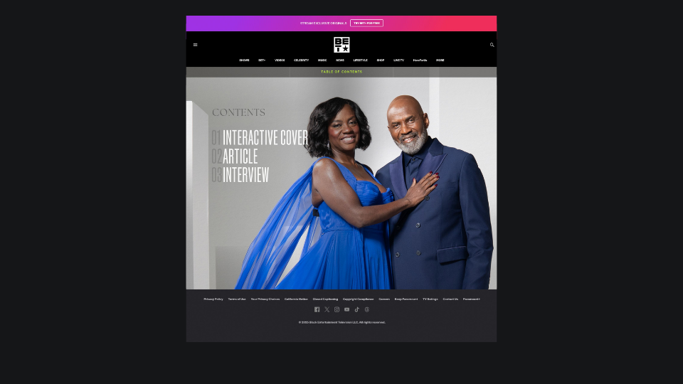 BET Media Group debuts their digital cover series "IMMERSED" with Viola Davis and Julius Tenon. A series highlighting culture shifters who have reshaped the landscape. The interactive pages serve as who’s who power series, brought to life through visually-stunning imagery shot by Black photographers, behind-the scenes exclusive interviews with icons and in-depth articles by a notable editor.